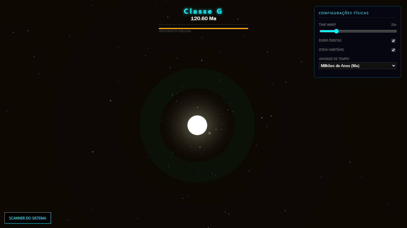- Ciclo de Vida Estelar: Acompanhe a idade da estrela em milhões de anos e a dissipação da nebulosa pela radiação (Fase T-Tauri).